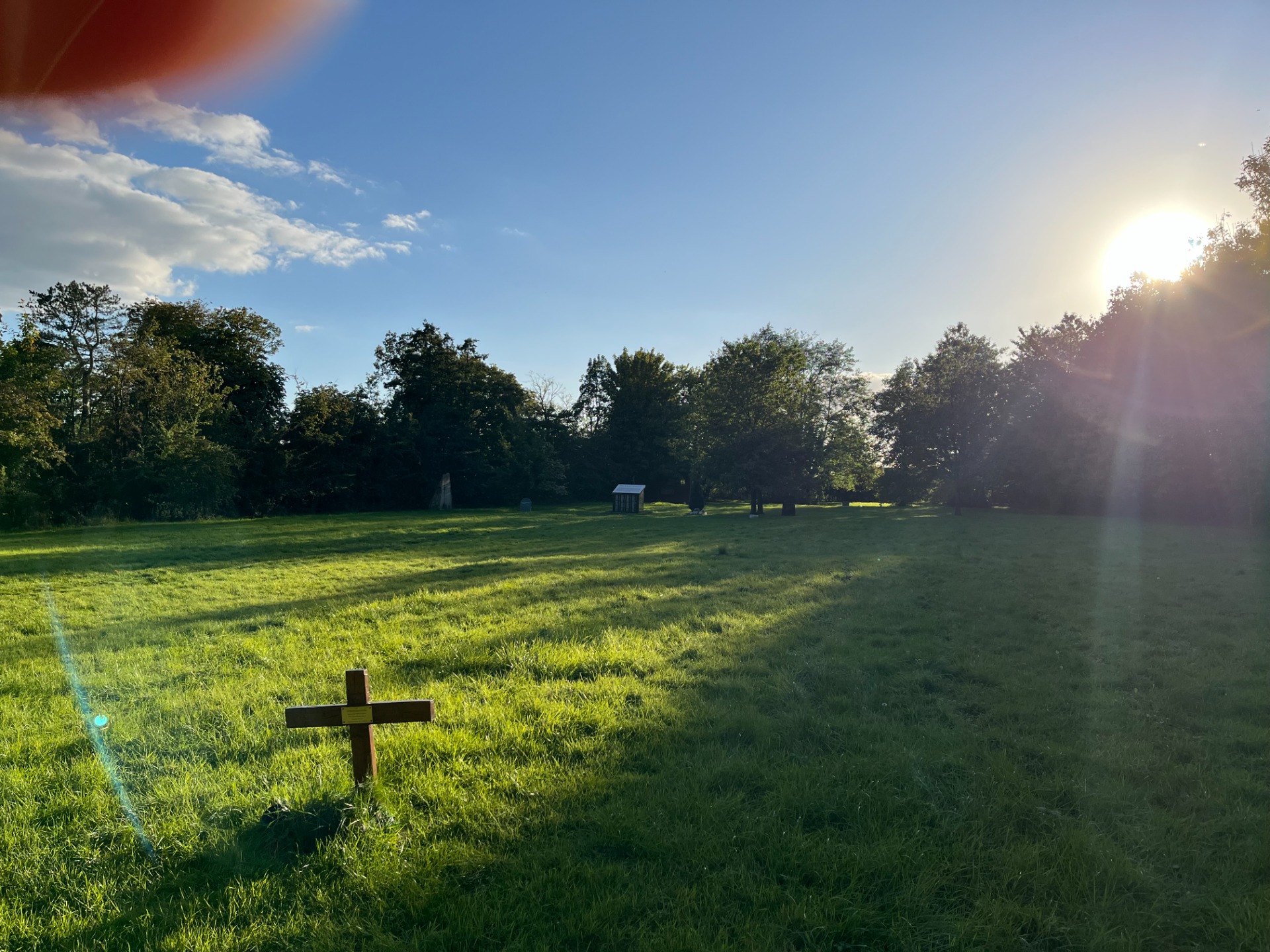 An early evening photo taken from behind Peter Jones's grave looking across towards the Memorial and the Hitman family graves. Behind the central row of trees is the former gravedigger's shed and the RC section of the Cemetery..