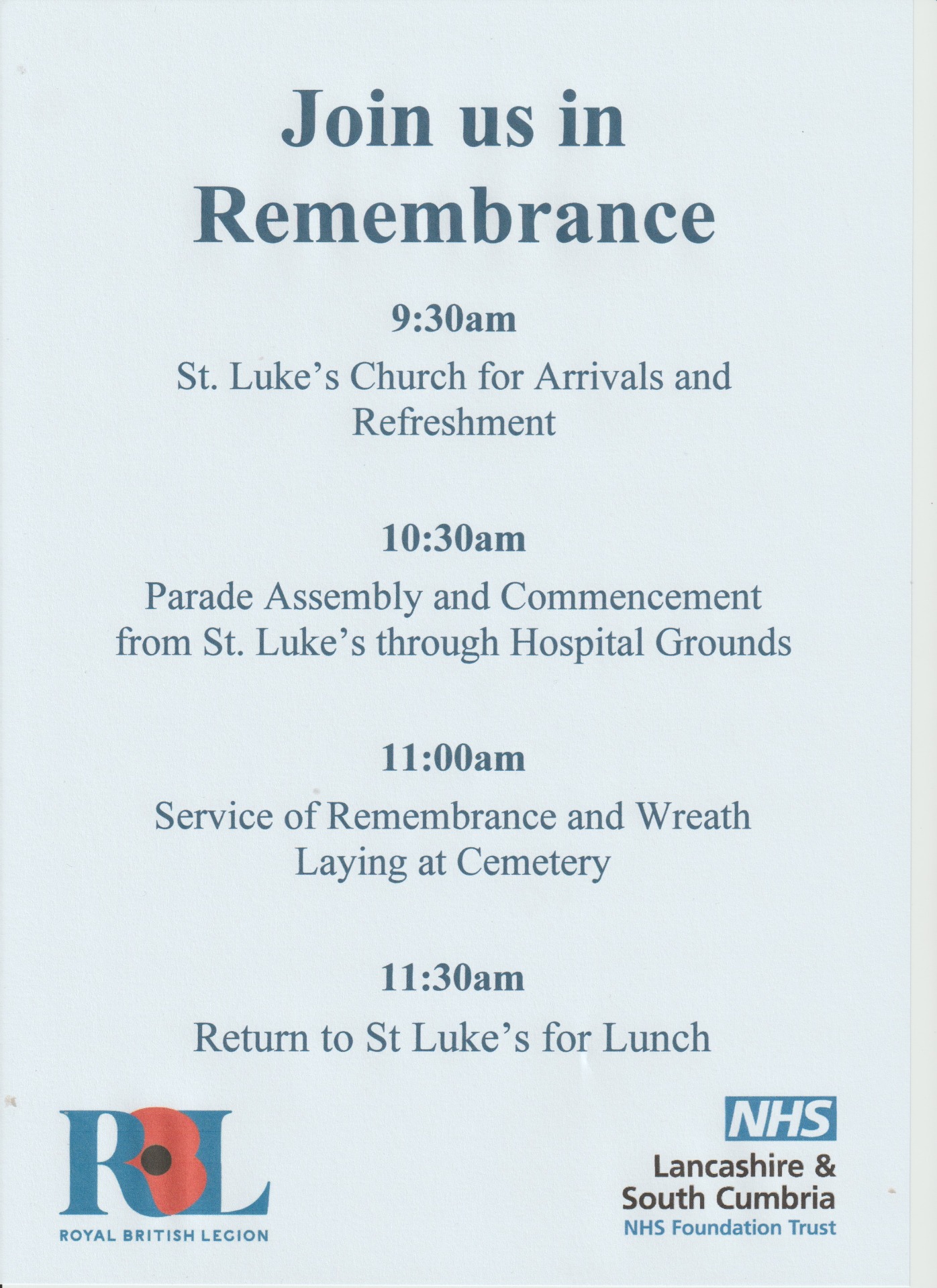 Joshua Counsell from Lancashire and South Cumbria NHS Trust has been in touch to confirm arrangements for Saturday 1st November 2025. Hopefully we will have good weather on the day and many of you will be able to attend.